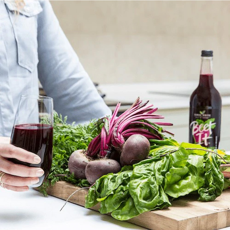 Beet It Organic beetroot juice is blended with 10% apple juice to smooth the earthy aftertaste of beetroot and with less sugar than your standard fruit juices, a glass of beetroot juice provides an even more enriching start to the day.