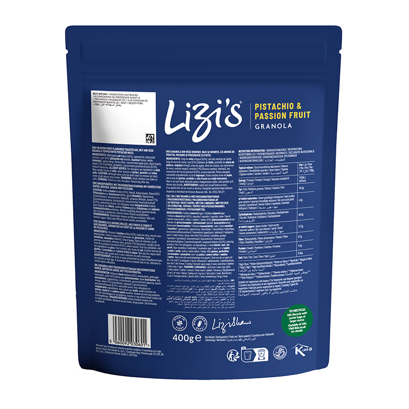 Lizi’s combined the unique texture and flavour of the best pistachios with the most perfumed passion fruit to make a unique granola. In this delicious new granola pistachios are pistachios in rich passion fruit puree with almonds, cashews, hazelnuts, seeds and oats. The result is sensational!