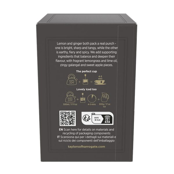 Taylors has add supporting ingredients that tame that intensity while also increasing its depth. We broaden the citrus canvas with lemongrass, lime oil and silver lime flowers, while the ginger root is accentuated with the addition of galangal (whose flavour is a close cousin). Lastly, apple pieces lend a little touch of sweetness, rounding off those sharp, fiery edges into something a shade more gentle.