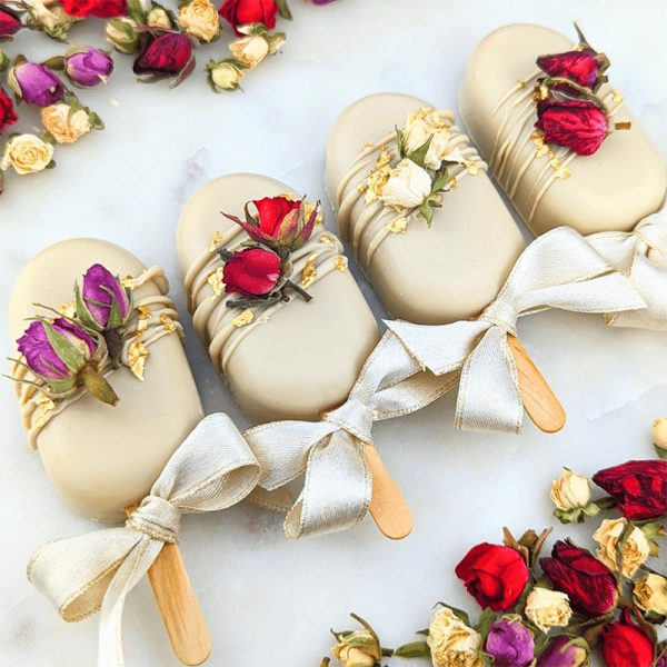 Ao contrário da Rosa Damascena, estas rosas decorativas não têm um aroma ou sabor próprio a rosas. Note que as rosas têm um caule verde na parte inferior que tem um sabor amargo quando ingerido.