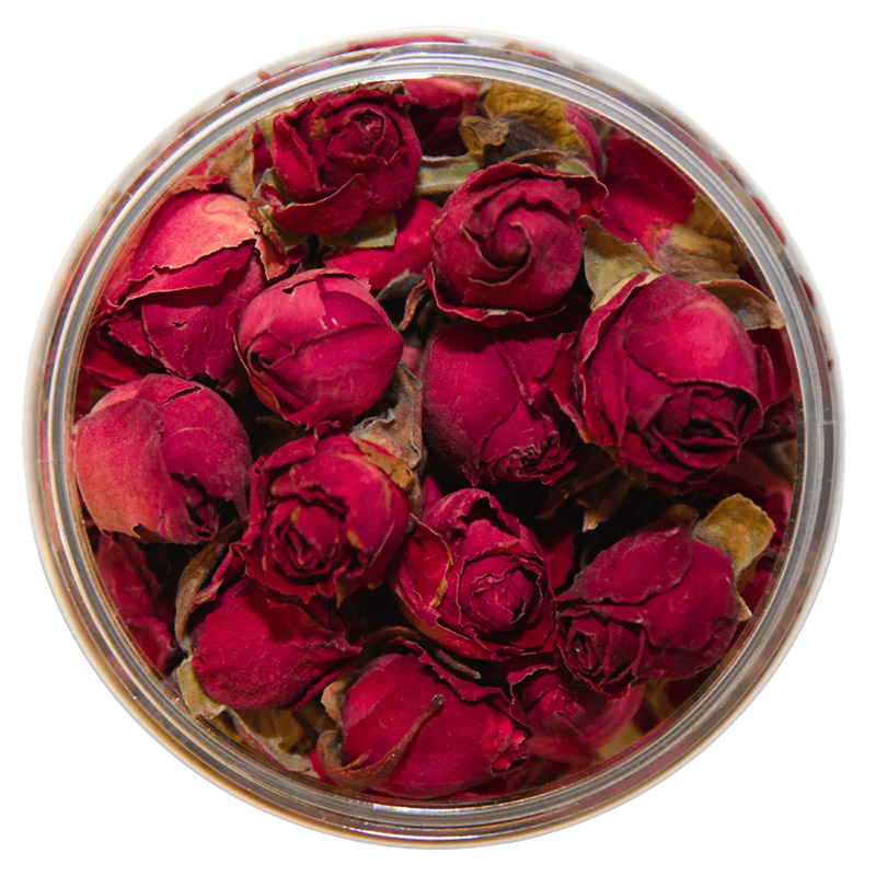 Botões vibrantes de rosa vermelha cereja com uma nota subtil ou ligeiramente amarga, colhidos à mão e naturais, perfeitos para realçar bolos, cocktails e pratos finos.